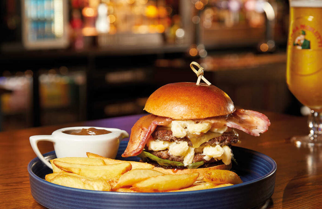 3oz cheese burger, 3oz beef patty, smoked cheese and burger sauce in a toasted brioche-style bun, with skin-on chips | 7.79 1177 kcals