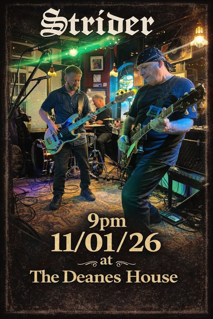 Get ready for a live music night to remember as Strider brings their powerful, guitar-driven sound to Deanes House on Sunday 11th January at 9pm. Known for their electrifying performances, tight rhythm section, and classic rock energy, Strider live at Deanes House is the perfect way to end your weekend with great music, atmosphere, and drinks. If you’re searching for live bands near me, Sunday night live music, or the best rock gig at Deanes House, this is the event you don’t want to miss. Come early, grab a pint, and experience one of the best live rock performances around. 🎸🔥