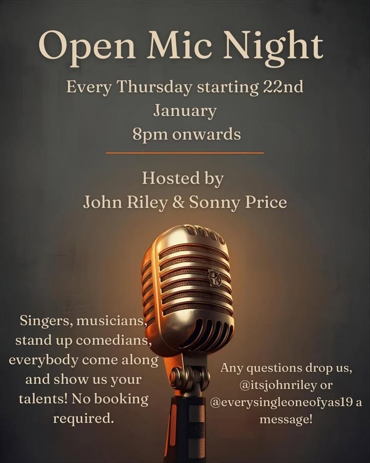 🎤 OPEN MIC NIGHT 🎶 Every Thursday 8pm 📍 The Deanes House Starting Thursday 22nd January 👏 Whether you’re a singer, guitarist, poet, comedian, or just love supporting local talent — this night is for YOU. Grab the mic, try something new, or sit back with a drink and enjoy the atmosphere 🍻🎸 ✨ All abilities welcome ✨ Friendly crowd ✨ Great drinks & vibes Tag your mates, bring your talent, and let’s make Thursdays something special 🙌 #OpenMicNight #LiveMusic #LocalTalent #Prescot #SupportLocal #ThursdayVibes #OpenMicUK #DeanesHouse